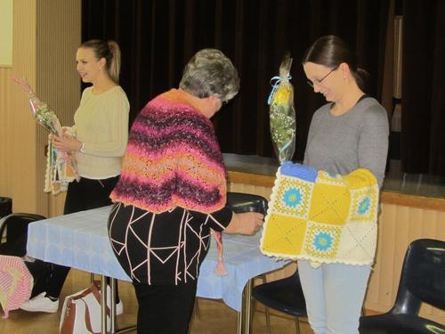30.1.2018 Tillintuvan Tiistaikerhossa meillä oli tilaisuus päästä osallistumaan lämminhenkiseen tapahtumaan jossa luovutettiin yhdistyksemme jäsenen Hilkka Virtasen neulomat vauvapeitot kahdelle viime vuoden (2017) viimeisimpinä syntyneiden paimiolaisvauvojen (tytö ja poika) äideille Jenny Etholenille ja Marjo Särkilahdelle. Hilkka on yksi yhdistyksemme OikeinNurin -kerhon aktiivitoimija